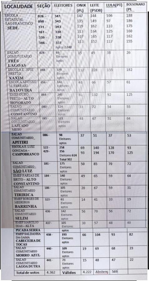RESULTADOS DO 2° TURNO DAS ELEIÇÕES GERAIS 2022, DAS 24 SEÇÕES ELEITORAIS DO MUNICÍPIO DE PROGRESSO, PARA GOVERNADOR E PRESIDENTE.